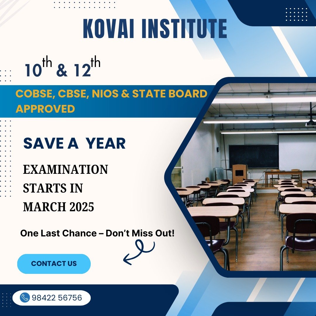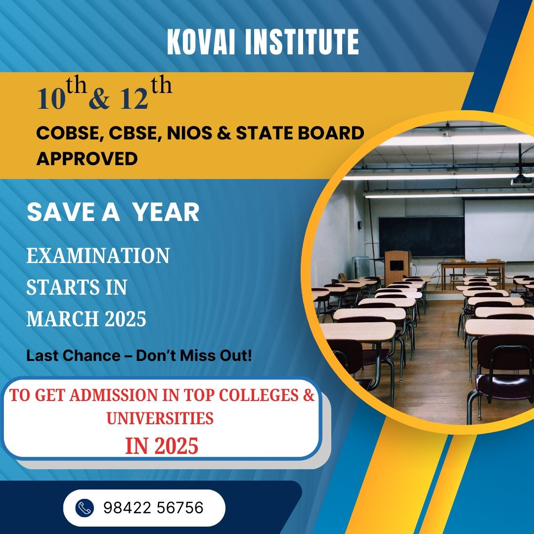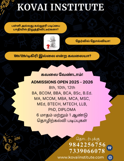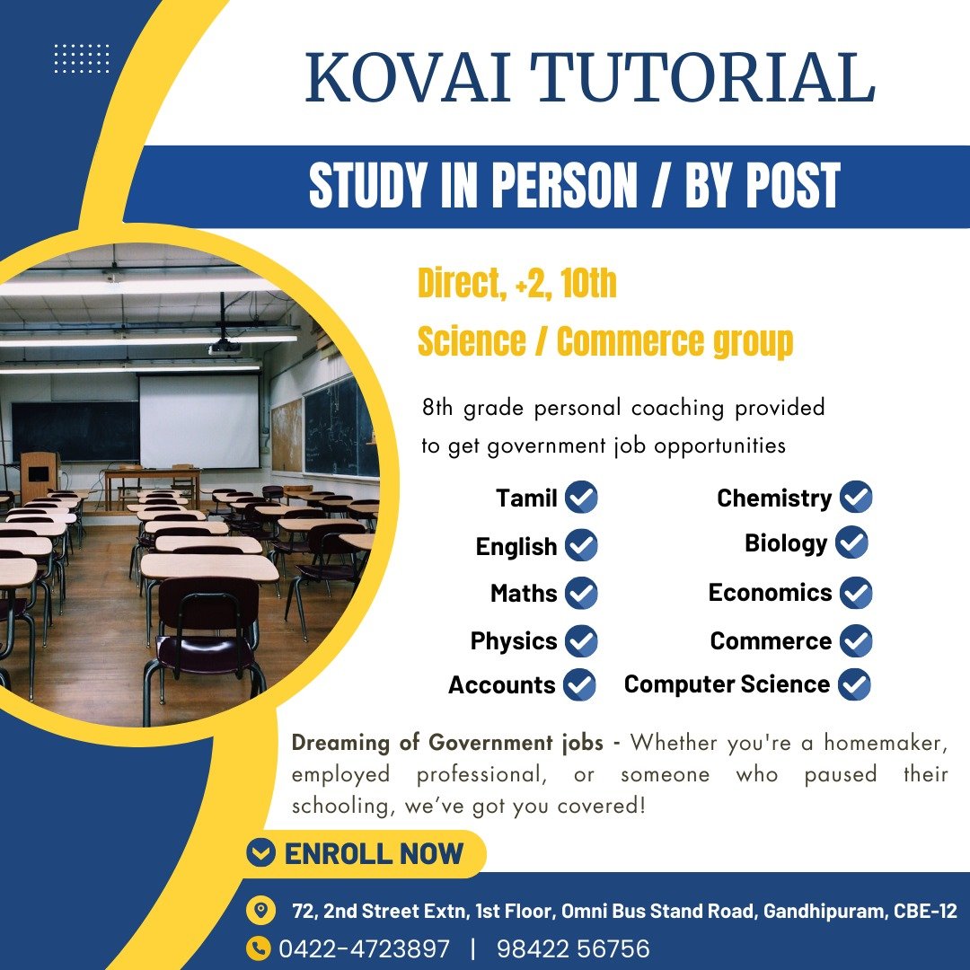 Kovai Tutorial & Tuition is a premier coaching center in Coimbatore dedicated to empowering students with quality education and personalized guidance. We specialize in helping learners excel in academics through expert faculty, innovative teaching methods, and a supportive learning environment. Our focus is on building strong conceptual understanding, critical thinking, and confidence, ensuring every student achieves their academic goals with excellence.